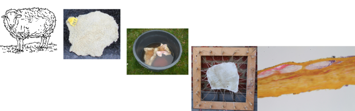 The skins from four lambs (Ovis aries) were taken from the Ovine Center of the University of Namur (natural deaths*). Parchments were fabricated by Marc Fourneau according to historical recipes and the transformation of the animal skin was studied by histological analysis at the different stages of the manufacturing process. More details can be found in the article entitled "Histological study of sheep skin transformation during the recreation of historical parchment manufacture" (see Publications).