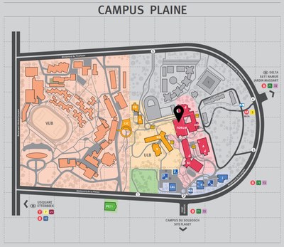 The Plaine campus can be reached by motorways E411 (Namur), E42 (Liège), E19 (Paris-Mons), and E40 (Ostend), then Boulevard Général Jacques or Boulevard du Triomphe.